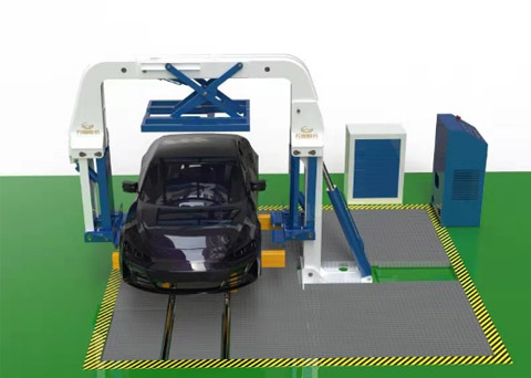 该翻转设备可以将操作车辆进行垂直90°翻转,从而可以使操作人员更加安全快捷的进行车辆底盘部件的拆解工作。同时配备三油缸同步夹紧装置配有压力传感器,可自适应车辆尺寸,可对不同车型进行自动夹紧,翻转操作,确保操作过程中对车辆的固定作用。可使用一键操作功能按键进行全自动操作,及三油缸自动夹紧车辆,然后主油缸进行车辆翻转操作,同时具备一键回落车辆功能,设备整体自动化程度高。并且配备全油缸点控控制按键进行适当微调。可以帮助操作人员自行设置成适当作业位置(角度)。同时设备兼容轨道式小车流水线运输,提升操作人员工作效率。设备拥有摄像头+雷达识别功能,可以识别作业区内是否有人员,如识别出有人员出现状况时设备将强制停止继续作业避免在设备运行过程中产生安全事故。此设备配有全操作区域防水槽,蓄水槽,防止车辆废液等有害液体渗透到地面造成污染,以及防止人员在作业过程中存在滑到的风险。同时可配装接油装置,将车辆渗透的油液进行收集,避免造成地面污染。同时此设备配装工具台,可方便操作人员进行高效操作。
